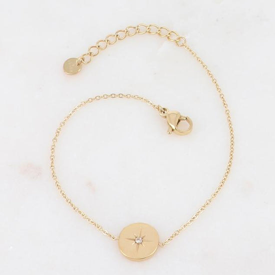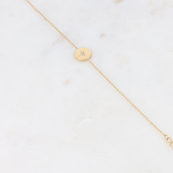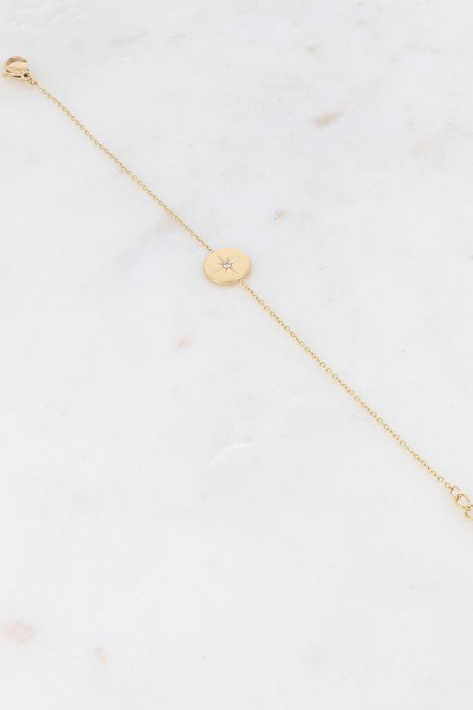 Bracelet réglable sur chaine avec un pendentif rond orné d'une étoile du nord strassée blanche.