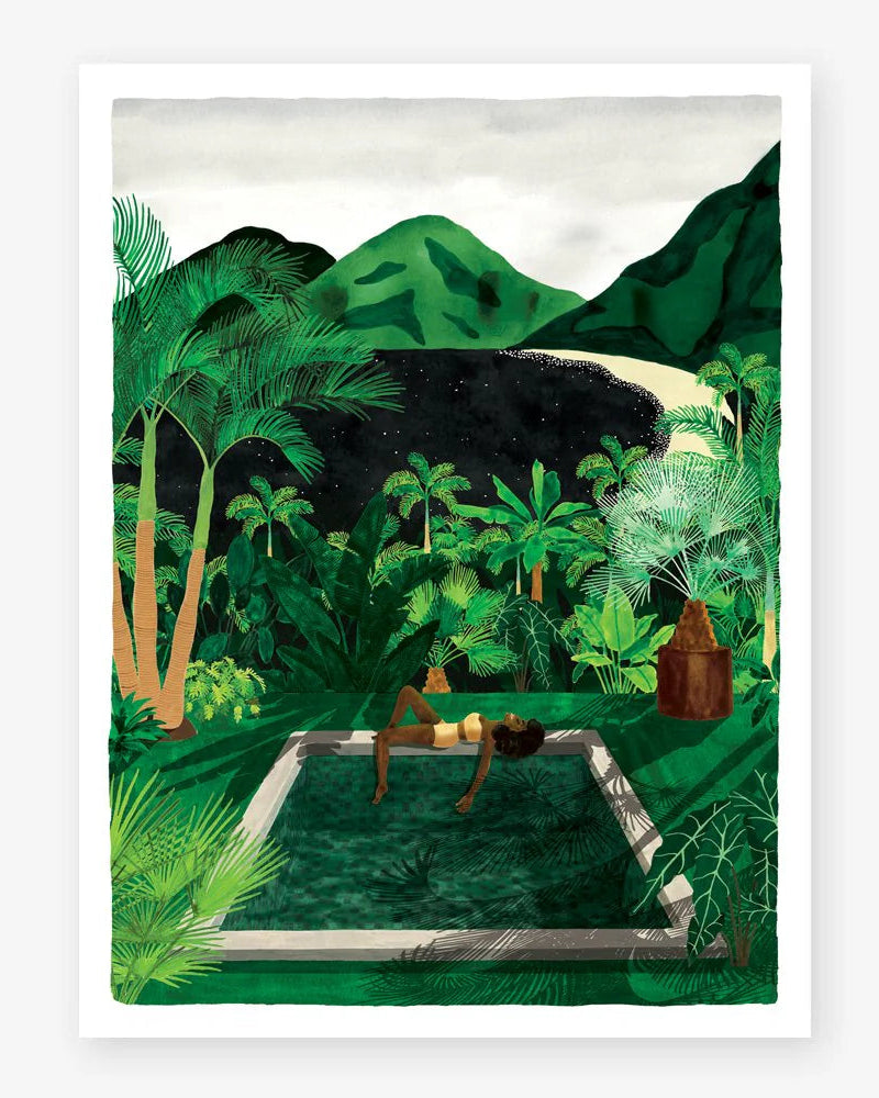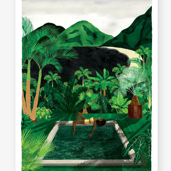 ⛰️🌴🌧️ Saisissez la quiétude avant l’orage avec ce poster Storm représentant une femme allongée paisiblement au bord d’une piscine, entourée d’une jungle luxuriante et de montagnes imposantes.