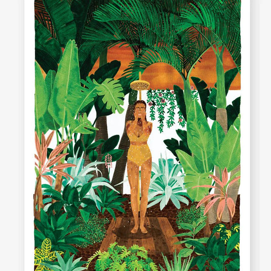 🌴🌞 Apportez de la fraîcheur à votre intérieur avec ce poster Summer Shower représentant une femme profitant d’une douche en plein air, entourée d’une végétation tropicale luxuriante.