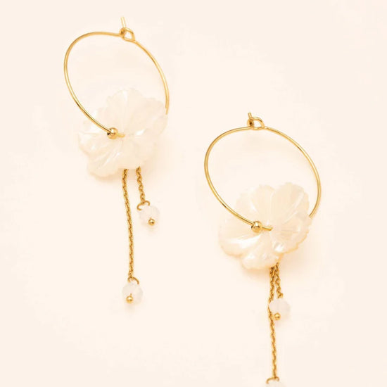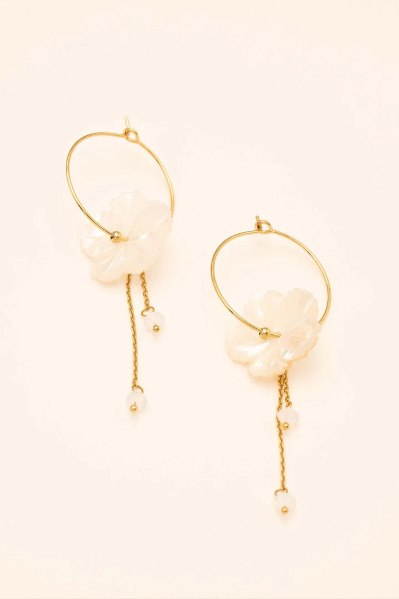 Grandes créoles toutes fines, composées d'un anneau avec une pampille fleur nacrée et de chaînes pendantes ornées de cristaux taillés.