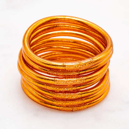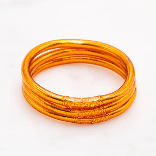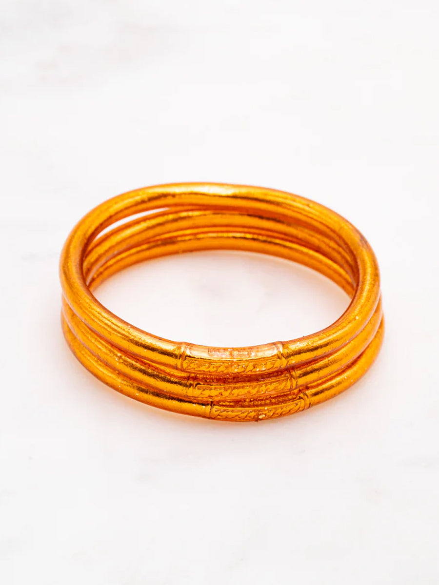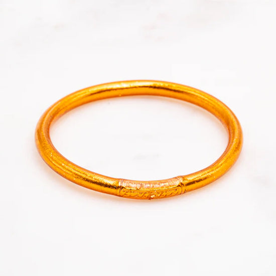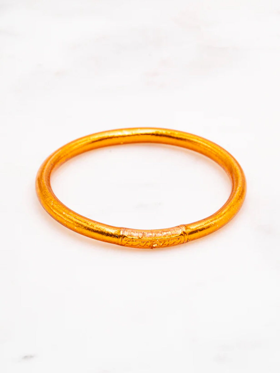 Craquez pour ce jonc souple transparent rempli de feuilles dorées décoratives, scellé avec un mantra gravé "Bonheur, Chance, Fortune et Amour" en thaïlandais. A cumuler sur le poignet.