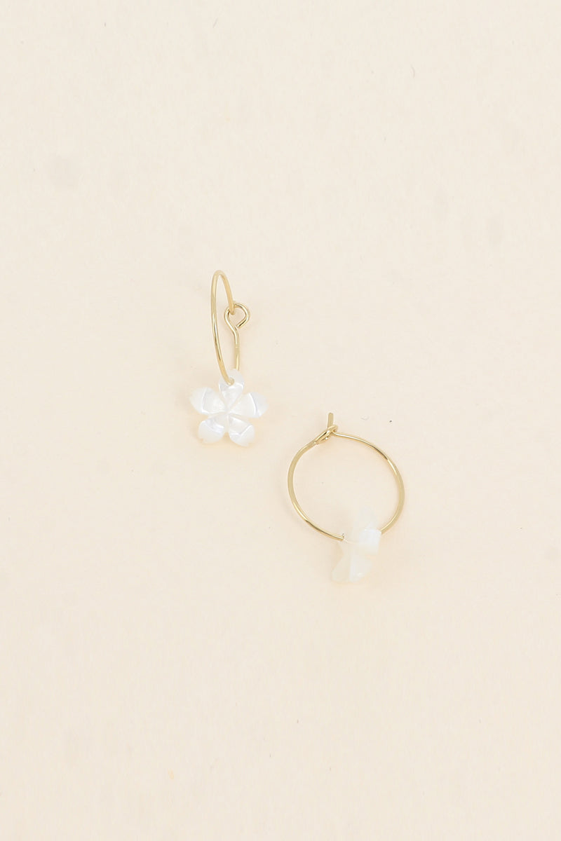 Boucles d'oreilles en acier inoxydable composées d'une fine créole et d'une petite fleur de cerisier nacrée 🌼.