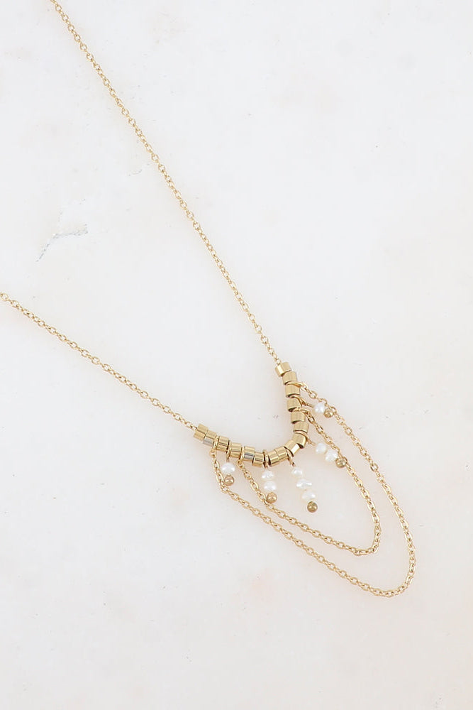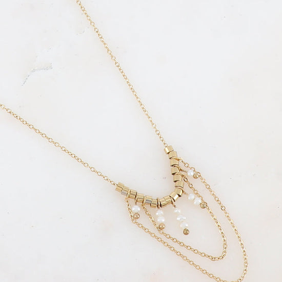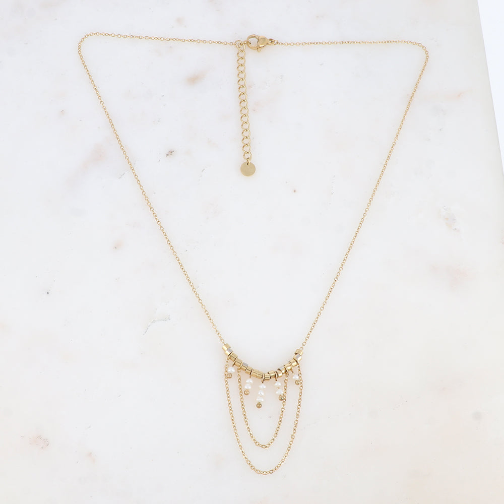 Collier réglable sur chaine composé de chaînes tombantes, de petites perles rondes en acier et de perles d'eau douce.
