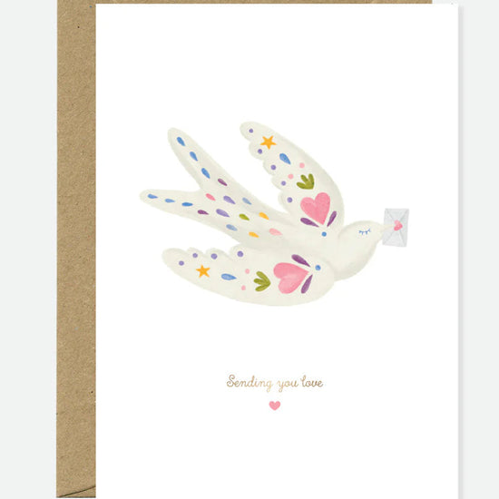 🕊️💌 La carte Sending Love Bird d’All the Ways to Say met en scène une colombe porteuse d’une enveloppe, décorée de motifs colorés et sublimée par des détails en dorure. Une manière poétique de transmettre amour, soutien ou réconfort.