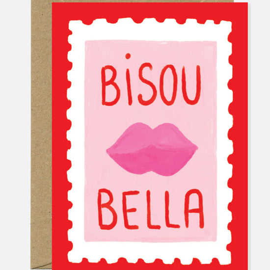 💋❤️ La carte Bisou Bella d’All the Ways to Say met en avant un design audacieux et ludique avec des lèvres roses vives et un lettrage rouge dans un cadre façon timbre.