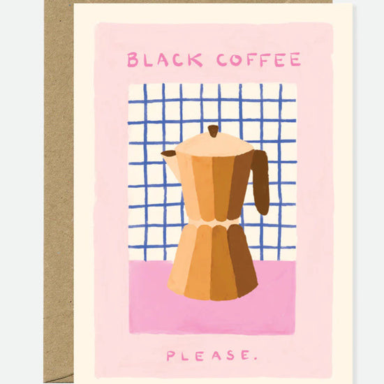 ☕L’illustration d’une cafetière moka, posée sur un fond graphique rose et bleu, est accompagnée du texte “Black Coffee Please” pour une touche pétillante.