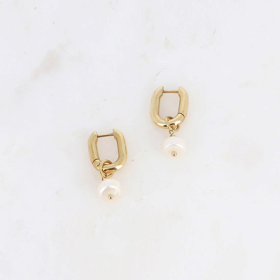 Boucles d'oreilles Daniela : mini créoles rectangulaires en acier inoxydable, ornées d'une perle d'eau douce authentique.