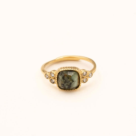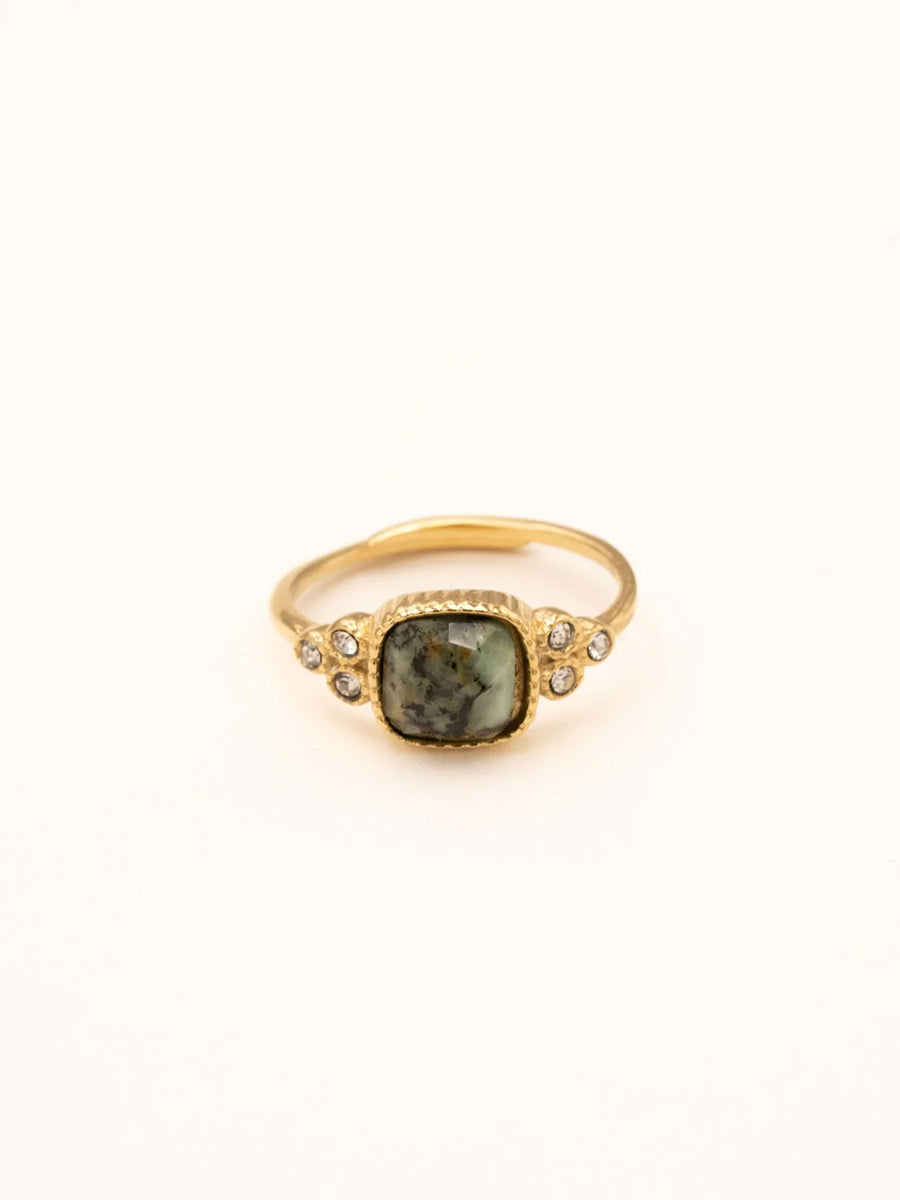 Bague fine en acier inoxydable composée d'une pierre de turquoise africaine carrée et de 6 petits cristaux.