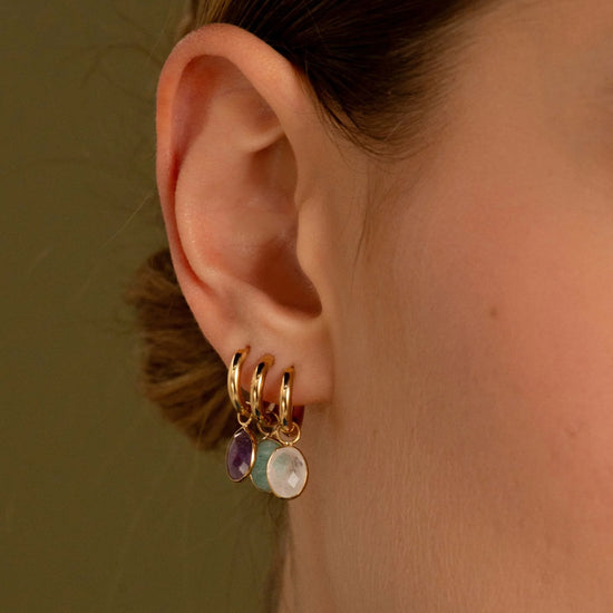 Boucles d'oreilles type créoles en acier inoxydable ornées d'un pendentif en pierre naturelle ovale taillée.