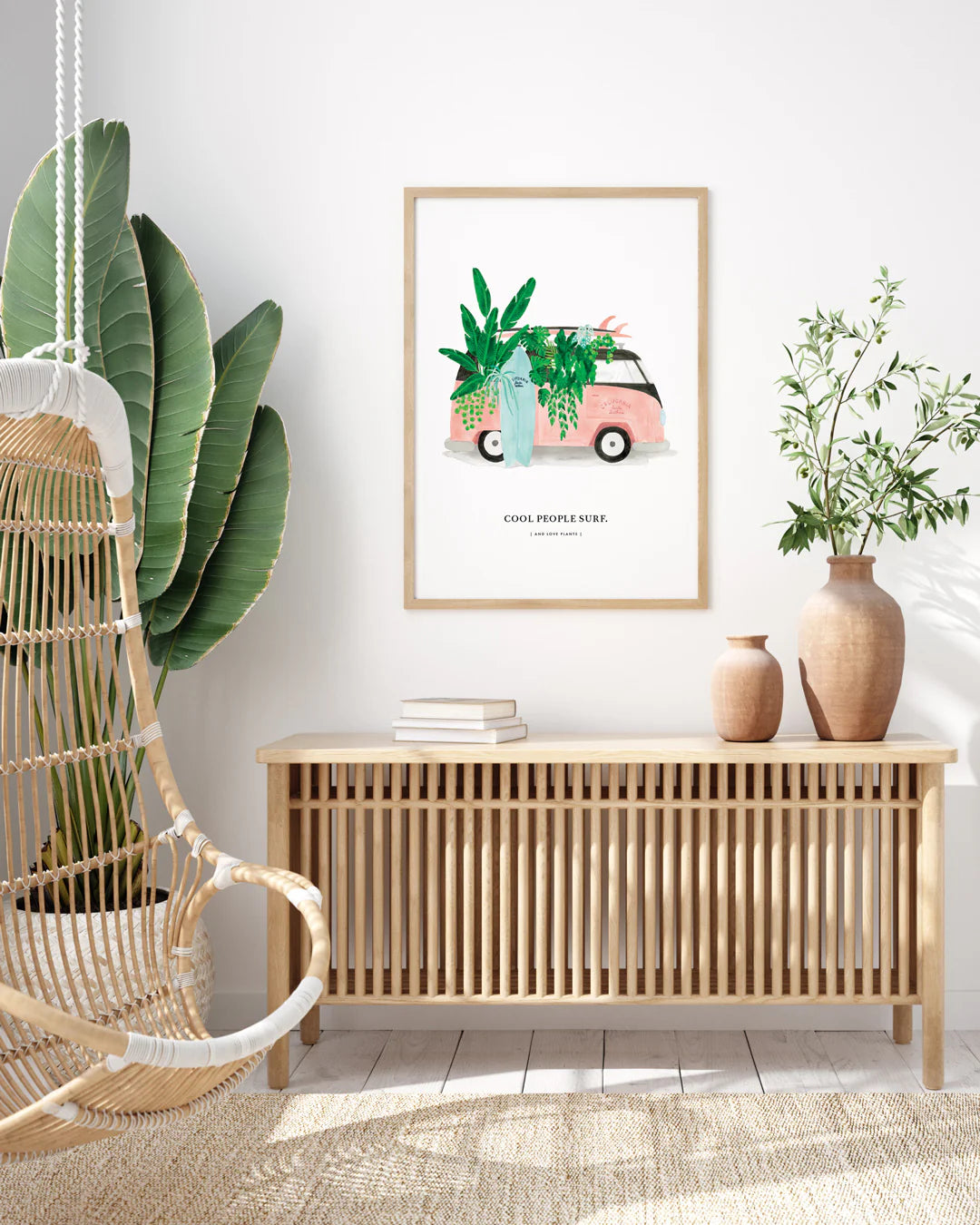 đŽCette affiche mĂȘle lâĂ©nergie du surf et la sĂ©rĂ©nitĂ© des plantes pour une dĂ©coration pleine de fraĂźcheur.