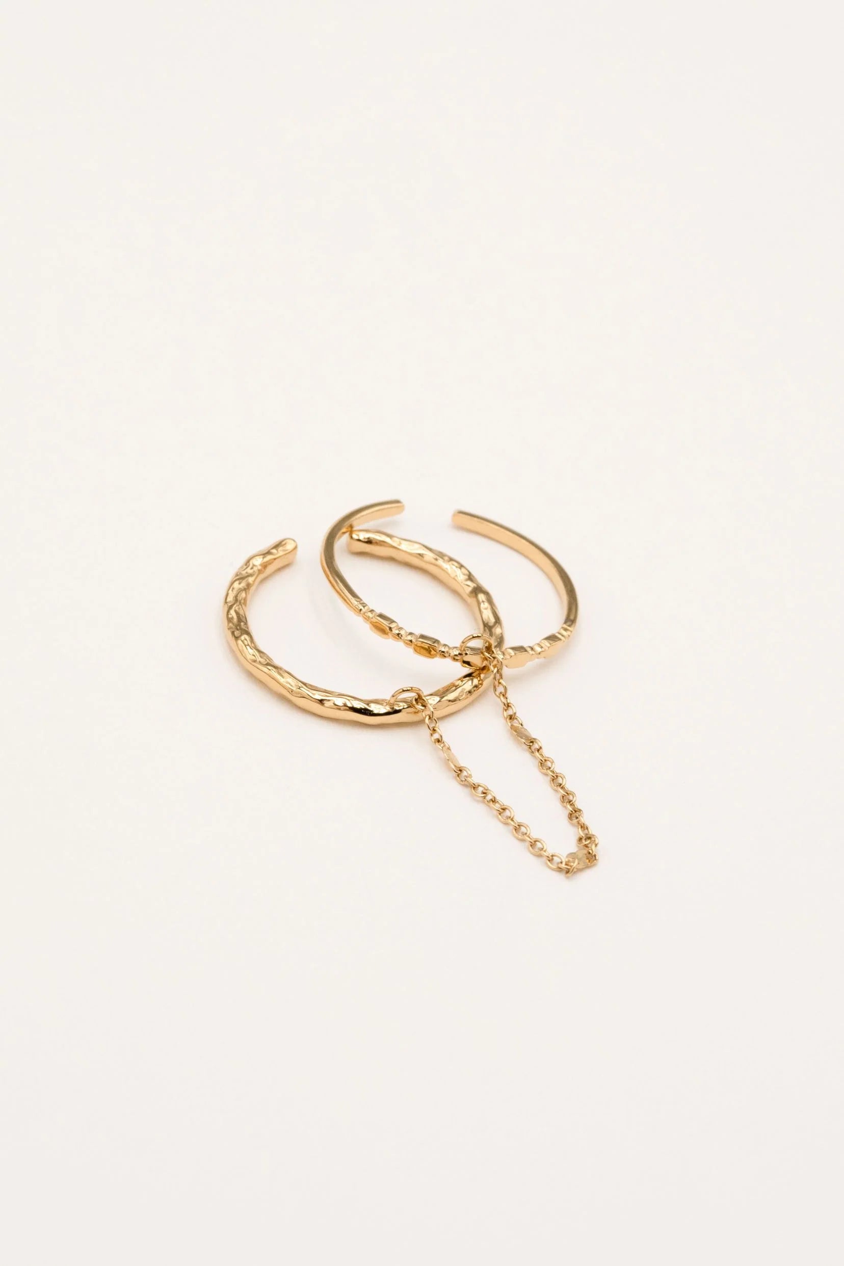 Bague en acier inoxydable composée de 2 anneaux reliés par une chaîne, l'un martelé et l'autre fin, avec des gravures géométriques. A porter sur 2 doigts, ou sur un seul.
