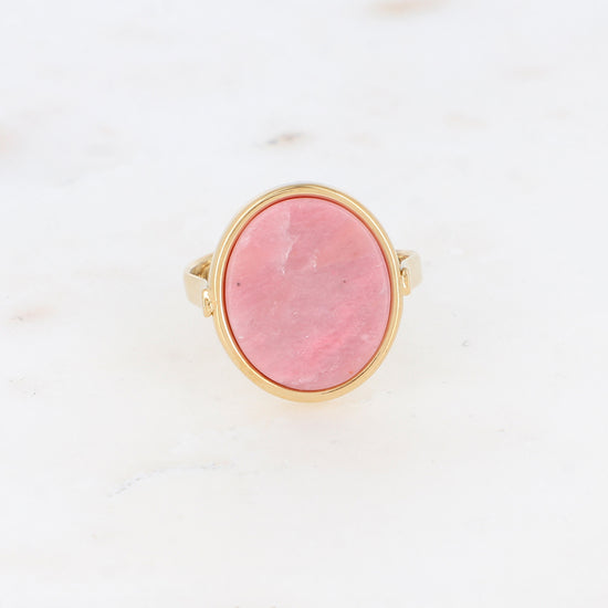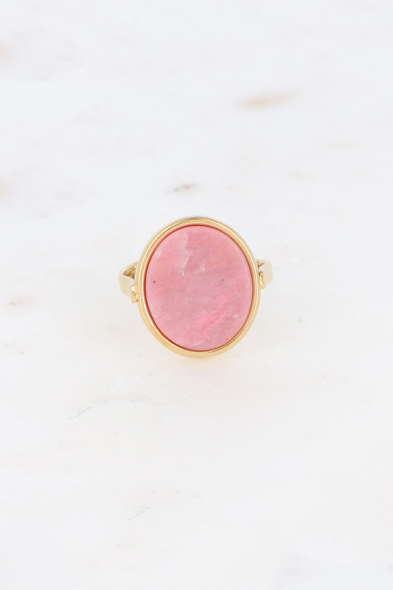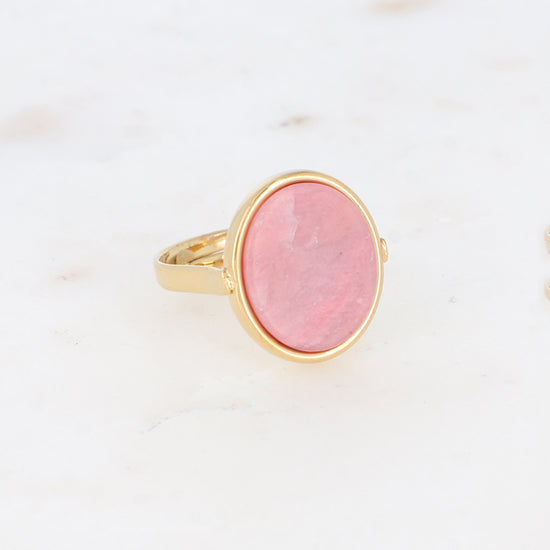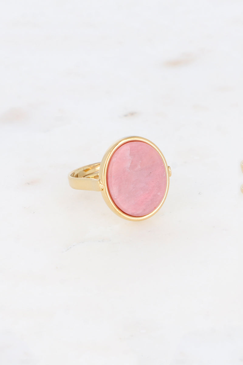 Bague ajustable ornée d'une pièce ovale sertie d'une pierre naturelle de rhodonite.