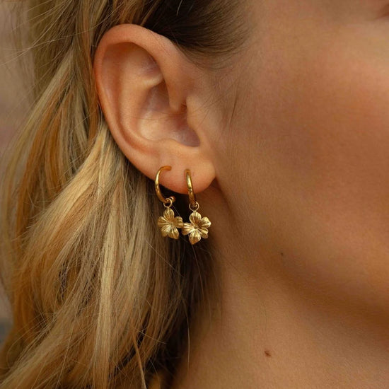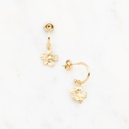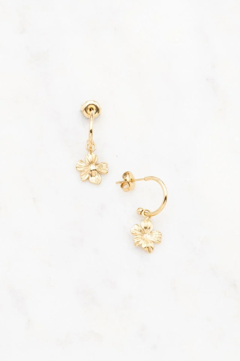 Boucles d'oreilles créoles ouvertes à puce, ornées d'un pendentif au motif floral texturé.
