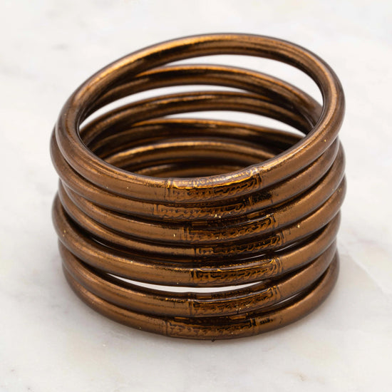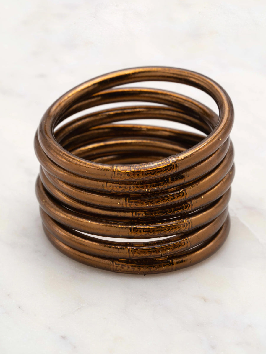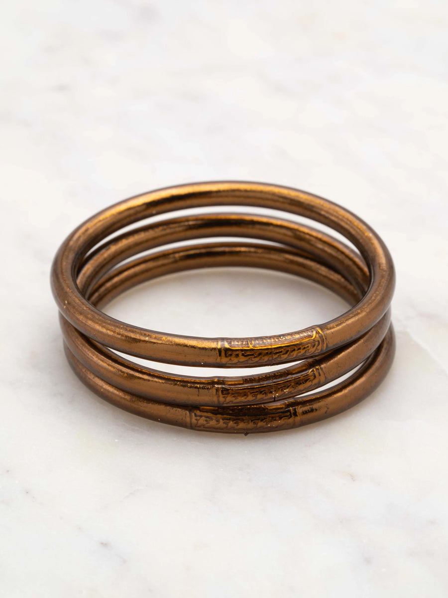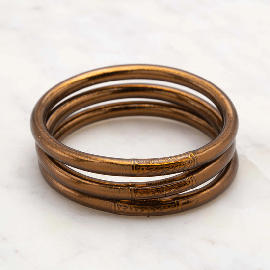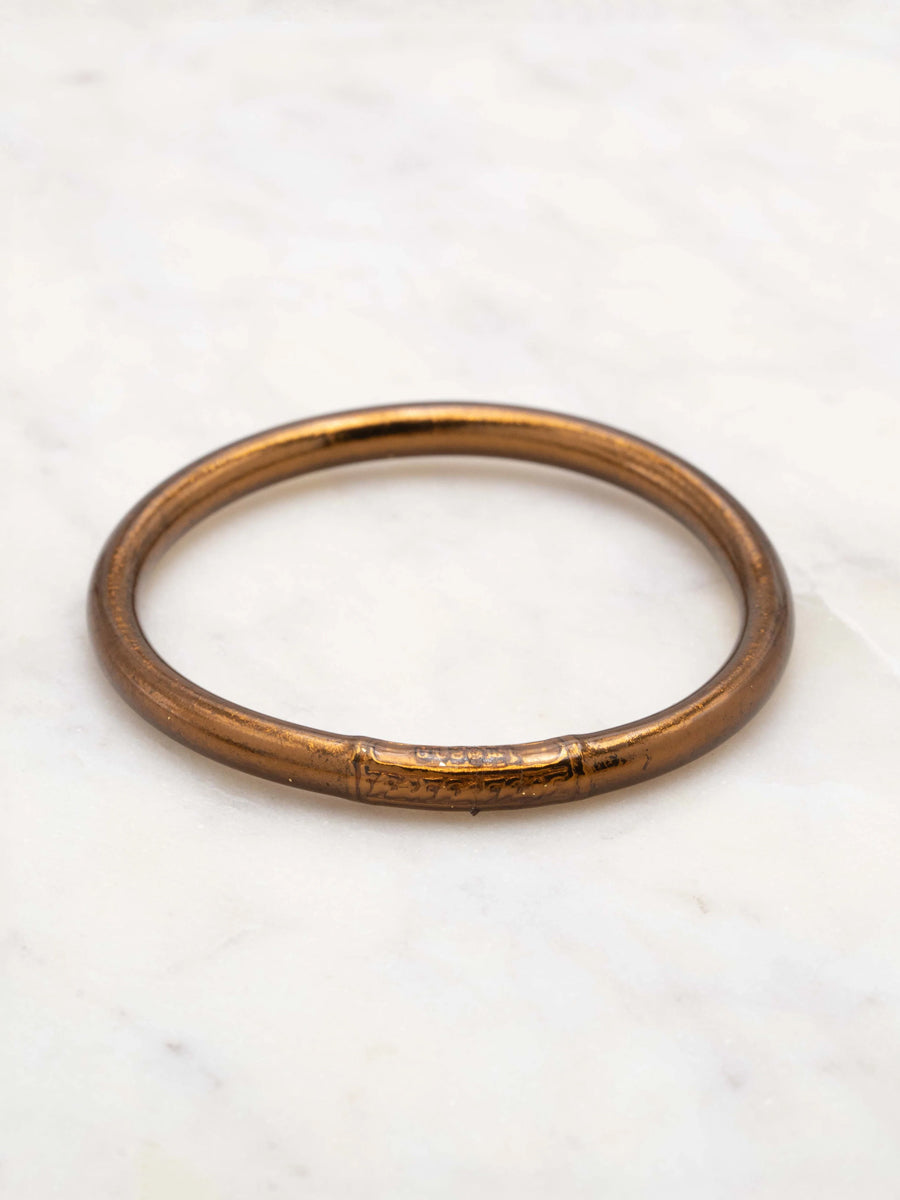 Craquez pour ce jonc souple transparent rempli de feuilles dorées décoratives, scellé avec un mantra gravé "Bonheur, Chance, Fortune et Amour" en thaïlandais. A cumuler sur le poignet.