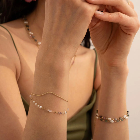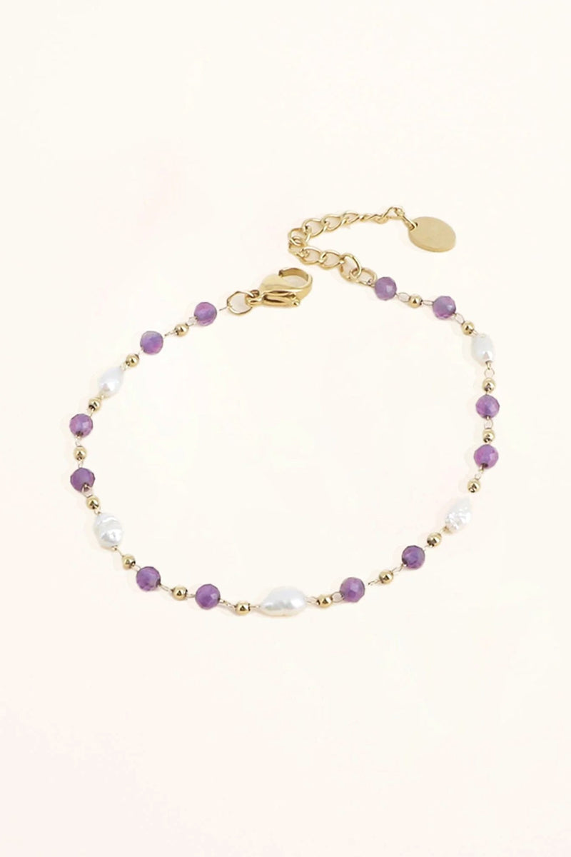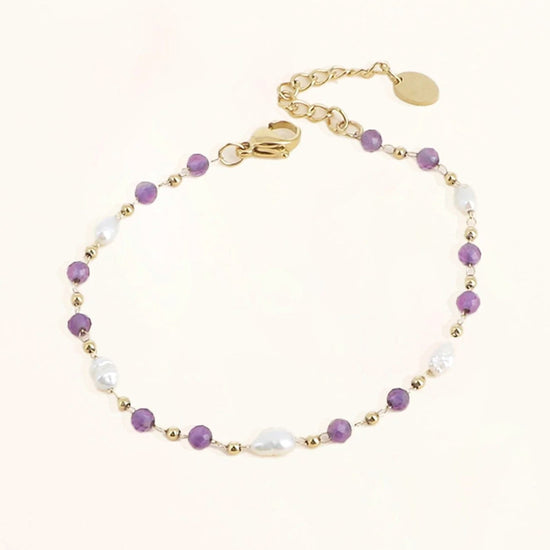 Bracelet en acier inoxydable composé de pierres naturelles, de perles d'eau douce, et de perles d'améthyste.