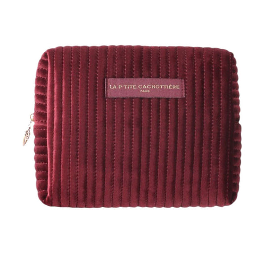 Trousse rectangulaire en velours matelassé couleur bordeaux.