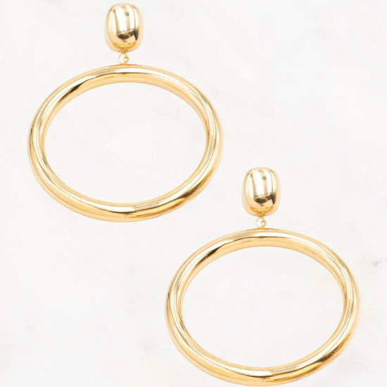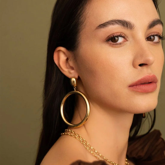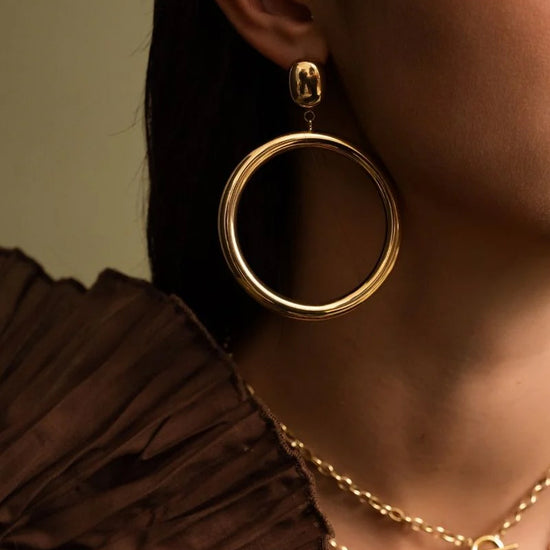 Grandes boucles d'oreilles graphiques à puce composées d'une pièce géométrique et d'un anneau rond lisse, effet miroir.