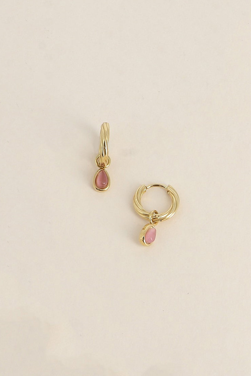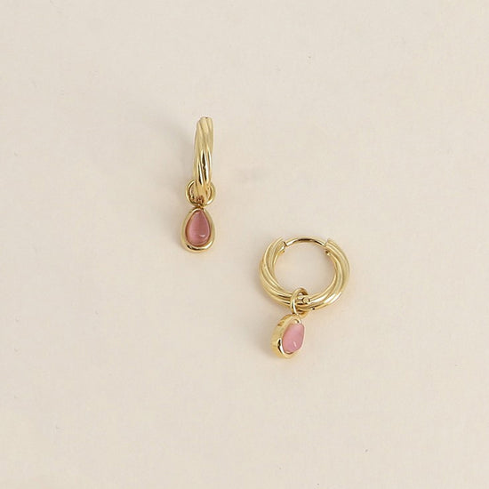 Boucles d'oreilles type créoles fermées en acier inoxydable composées d'un mini anneau torsadé et d'une pampille en forme de goutte en oeil de chat.