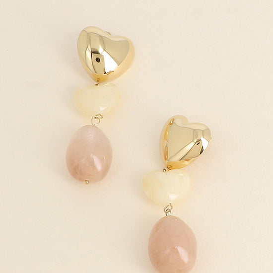 Grandes boucles d'oreilles pendantes en acier inoxydable composées d'un premier coeur doré, d'un second coeur et d'une pampille ovale en résine.