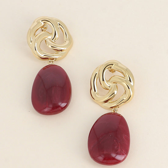 Grandes boucles d'oreilles pendantes en acier inoxydable composées d'une pièce en forme de fleur ajourée et d'une pièce ovale en résine.