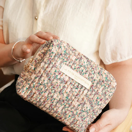 Grande trousse rectangulaire et à soufflet en coton matelassé imprimé fleuri.