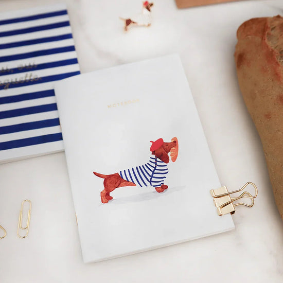 đ„đ¶ Lâun montre un teckel habillĂ© dâune mariniĂšre et dâun bĂ©ret rouge portant une baguette, tandis que lâautre affiche de larges rayures bleues ornĂ©es dâune inscription dorĂ©e.