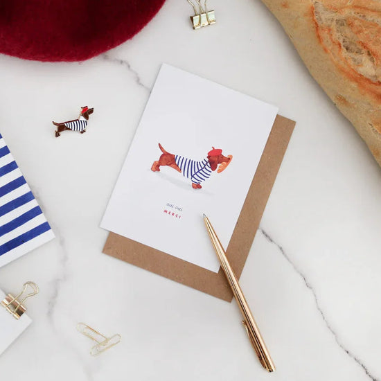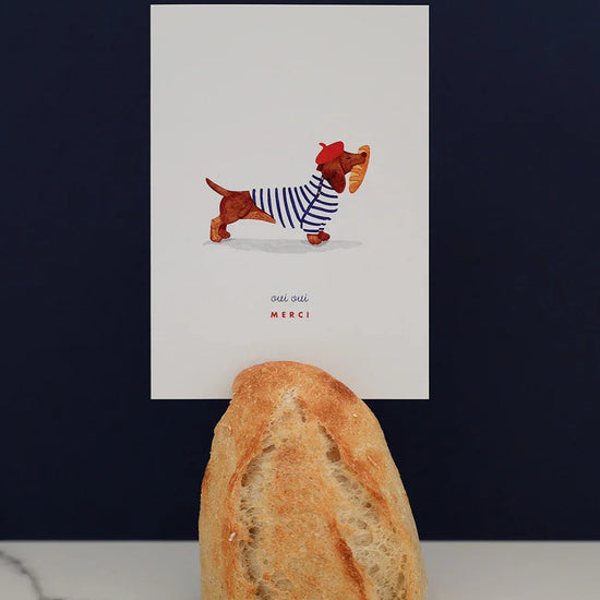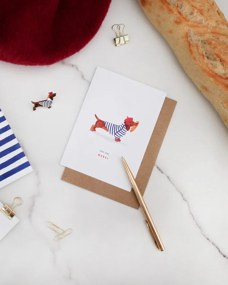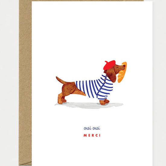 🐶🥖La carte Oui Oui Merci d’All the Ways to Say met en scène un teckel vêtu d’une marinière, d’un béret rouge et portant une baguette, un clin d’œil humoristique à l’art de vivre parisien.