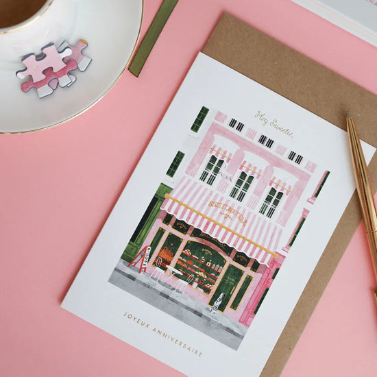 IllustrĂ©e dâune scĂšne de boulangerie remplie de gĂąteaux et de douceurs, sublimĂ©e par des dĂ©tails en dorure, elle est la recette parfaite pour souhaiter un joyeux anniversaire.