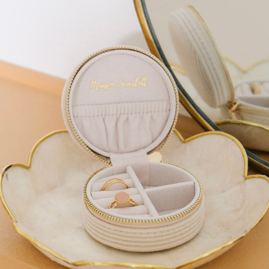 Yvonne en velours côtelé est la boîte à bijoux de voyage idéale et deviendra sans nul doute l’alliée de toutes vos aventures !