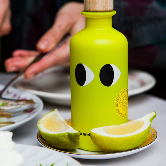 Huile d’olive extra vierge Yiayia & Friends, à faible acidité et à haute valeur nutritionnelle, avec une touche de citron.
