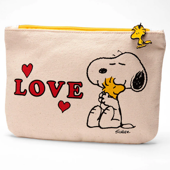 ❤️ Trousse en toile avec Snoopy et Woodstock faisant un câlin et la mention LOVE.
