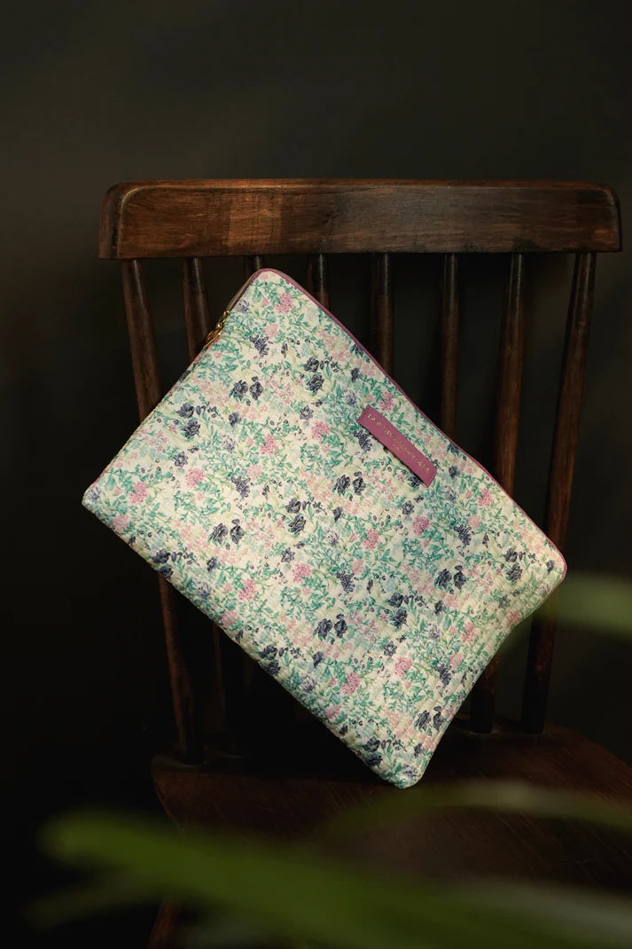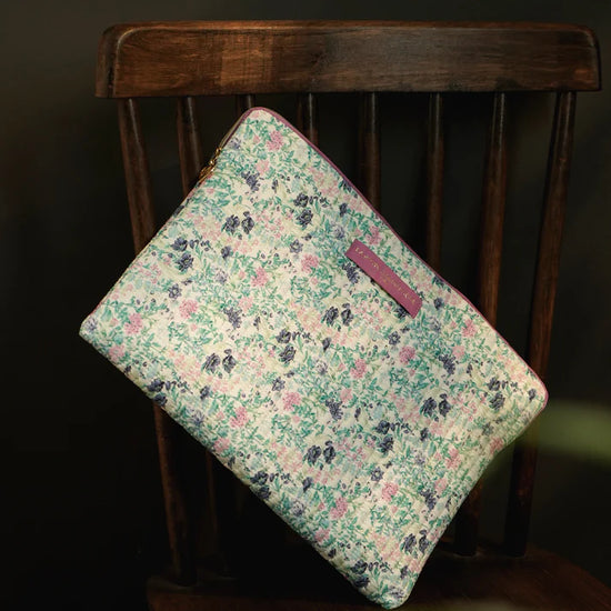 Pochette matelassée en coton fleuri, servant de housse de protection pour un ordinateur jusqu'à 14 pouces.