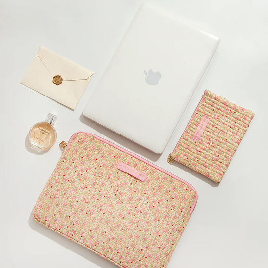 Pochette matelassée en coton fleuri, servant de housse de protection pour un ordinateur jusqu'à 14 pouces.