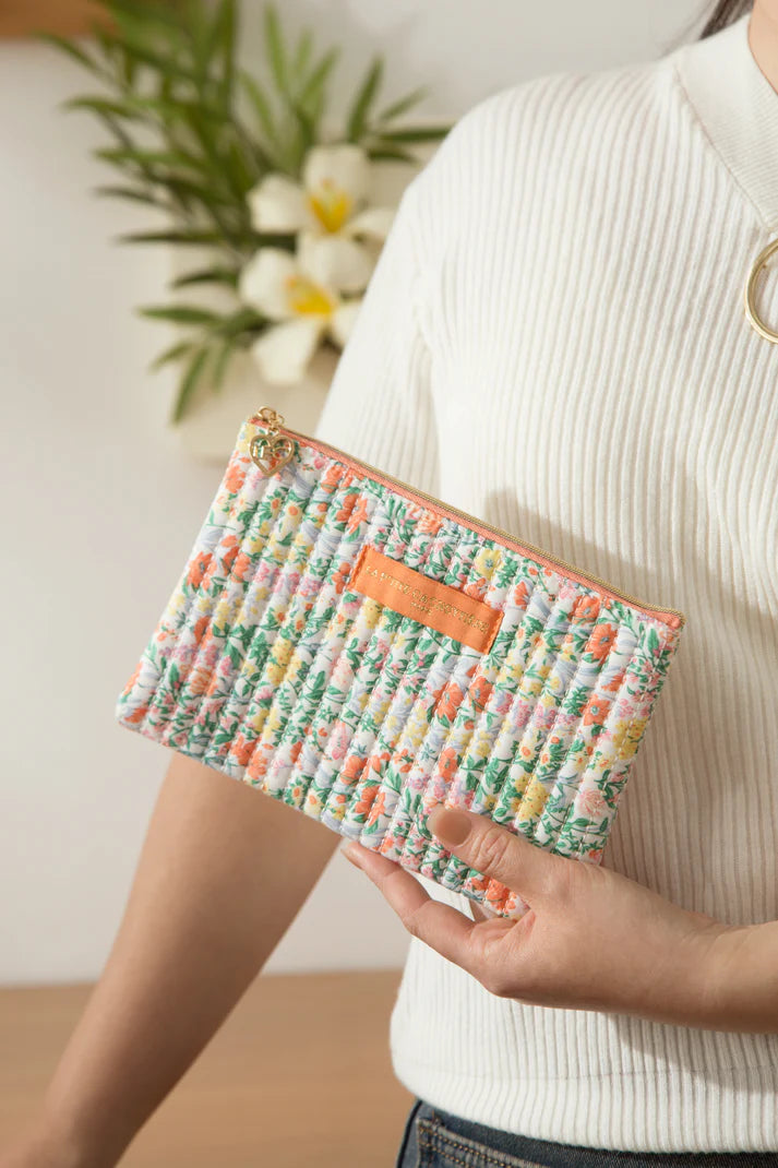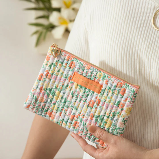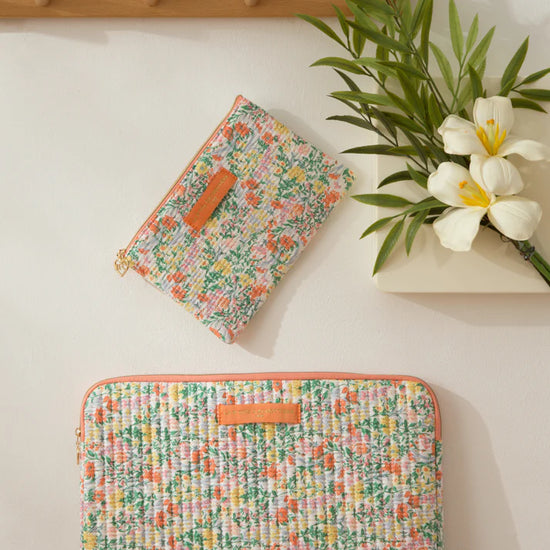 Pochette plate et rectangulaire en coton matelassé imprimé fleuri.