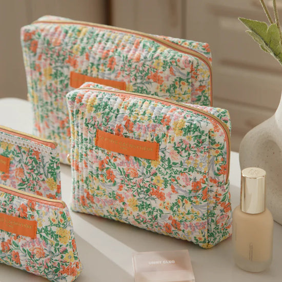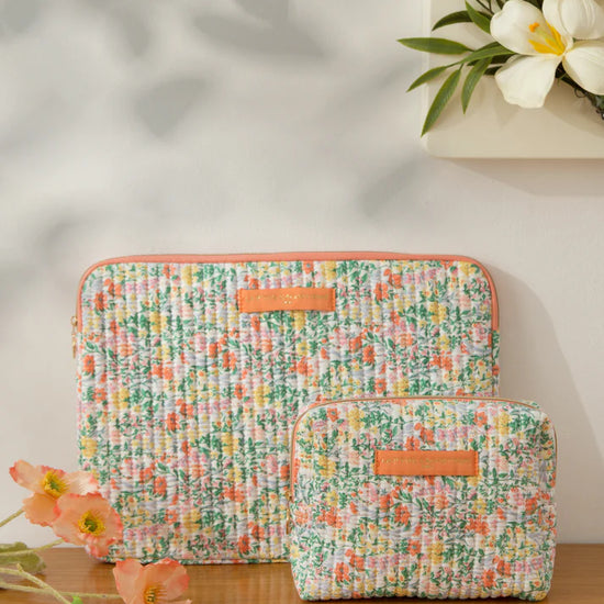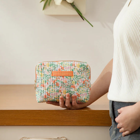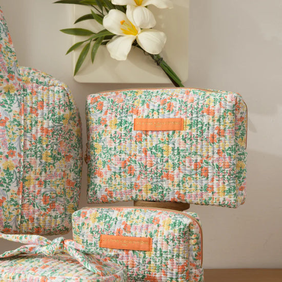 Trousse rectangulaire en coton matelassé imprimé fleuri.