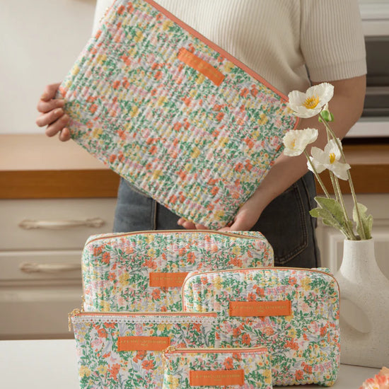 Pochette matelassée en coton fleuri, servant de housse de protection pour un ordinateur jusqu'à 14 pouces.