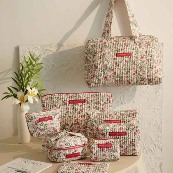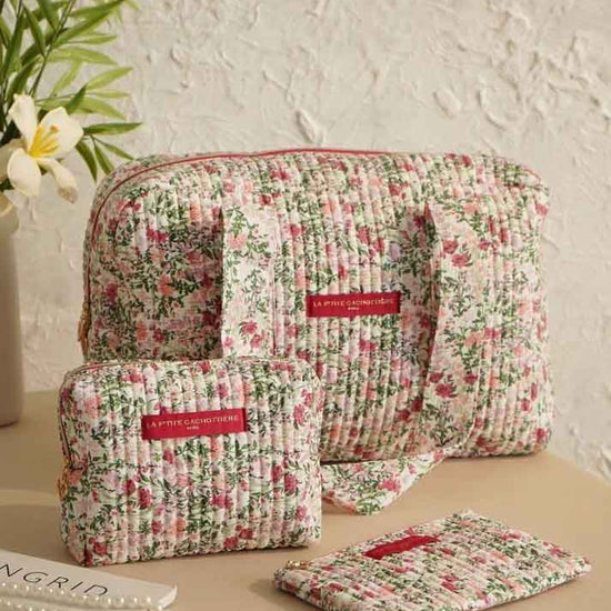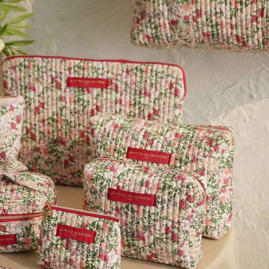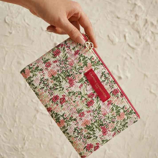 Pochette plate et rectangulaire en coton matelassé imprimé fleuri.