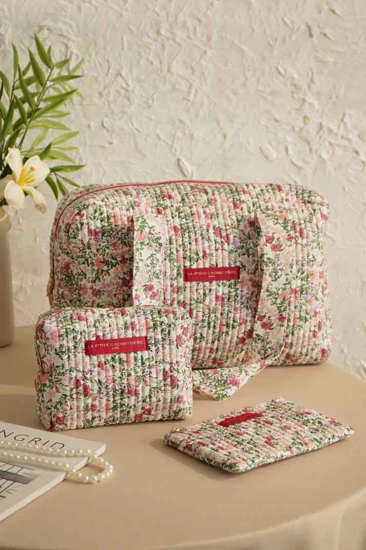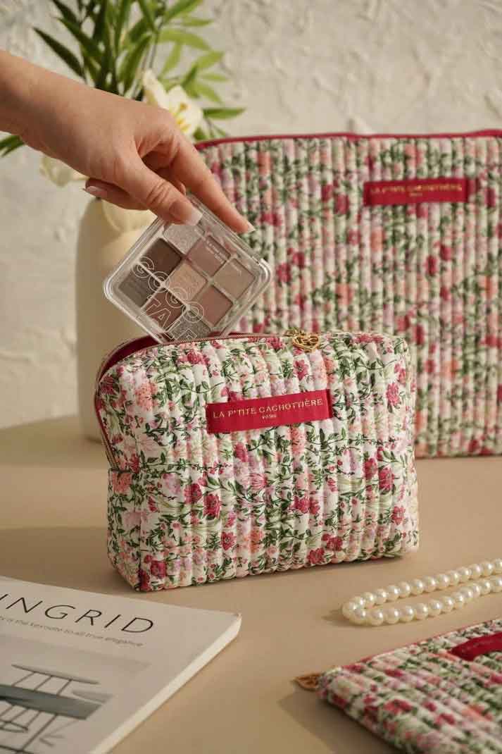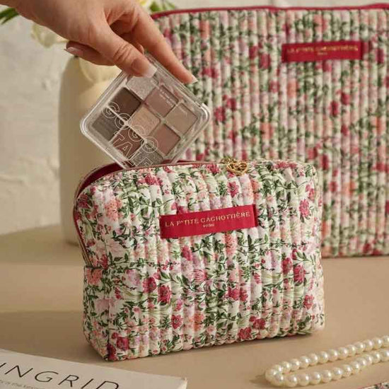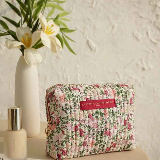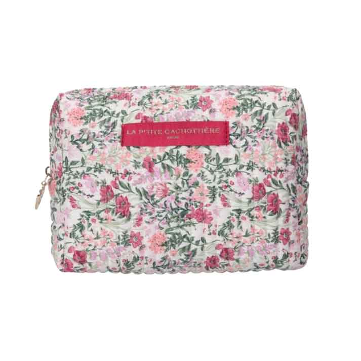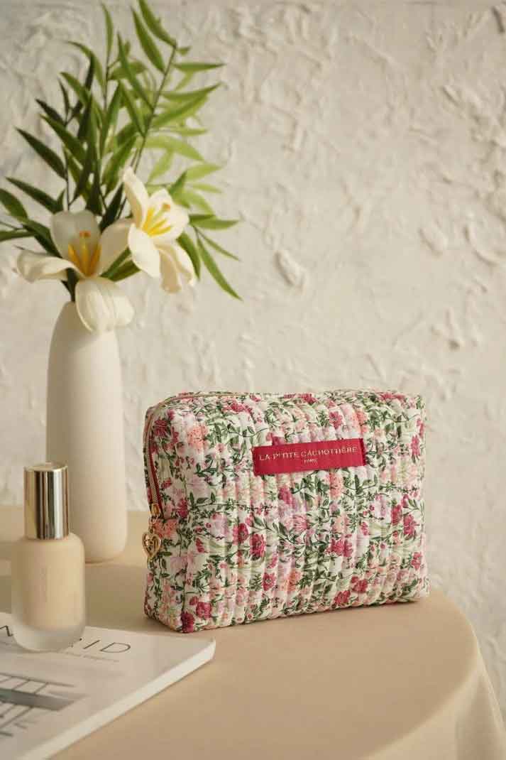 Trousse rectangulaire en coton matelassé imprimé fleuri.