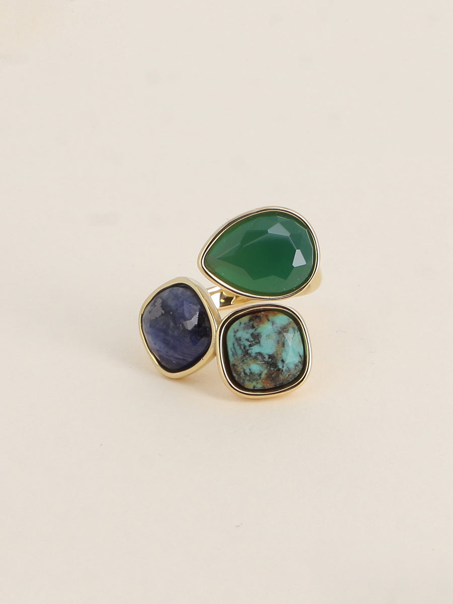 Grande bague ouverte en acier inoxydable composée de 3 pierres naturelles : 2 carrés en turquoise africaine et agate bleue et 1 goutte en Agate verte.