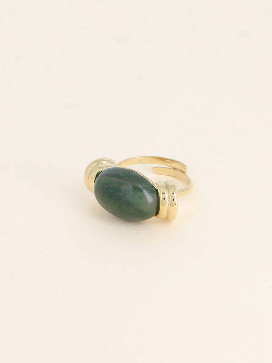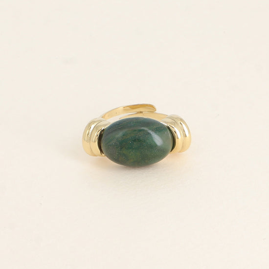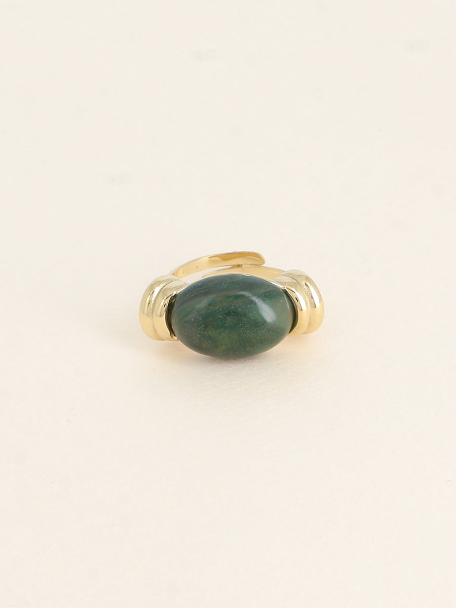 Bague en acier inoxydable composée d'une grande pierre ovale de jaspe vert.