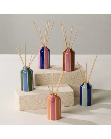 Un diffuseur de parfum, présenté dans un flacon en céramique peint à la main, et accompagné de tiges naturelles pour une diffusion longue durée et ultra parfumée.