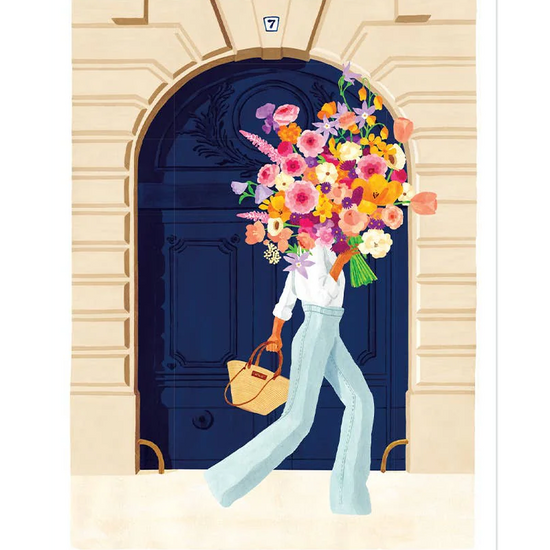 Un moment parisien figé dans le temps. Porte parisienne met en scène une femme se promenant dans les rues de Paris, portant un magnifique bouquet de fleurs. 💐
