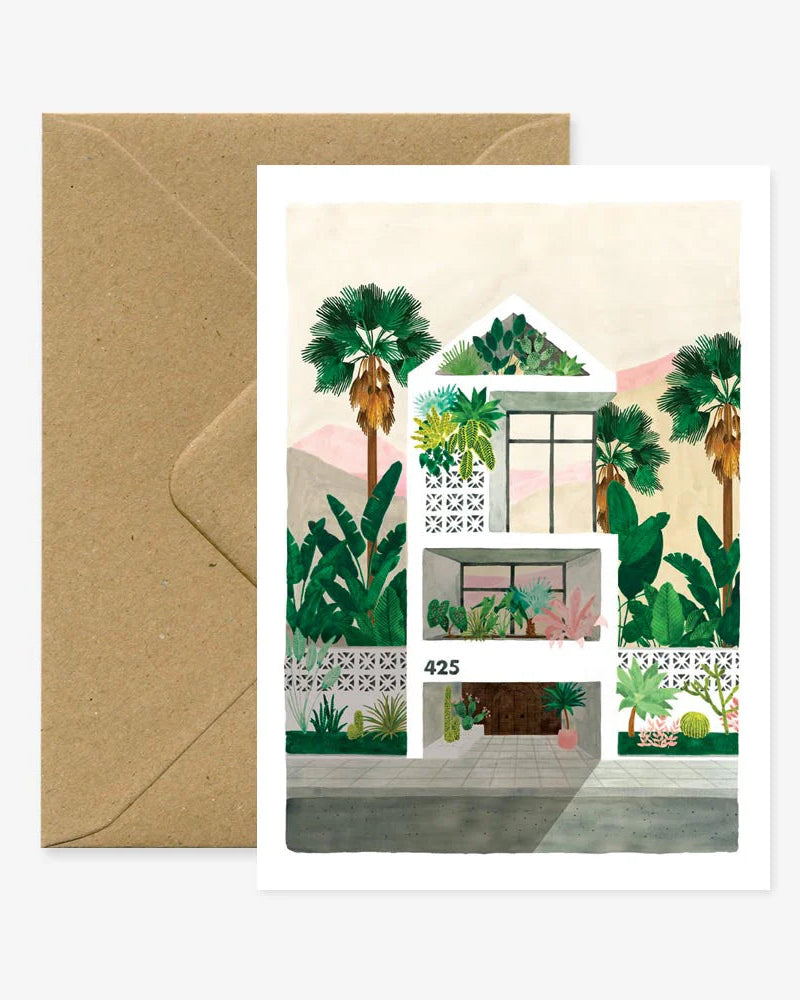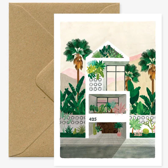 🏡Illustrée d’une maison moderne entourée de palmiers et de verdure, elle est parfaite pour une crémaillère, des félicitations ou simplement pour rêver en grand.