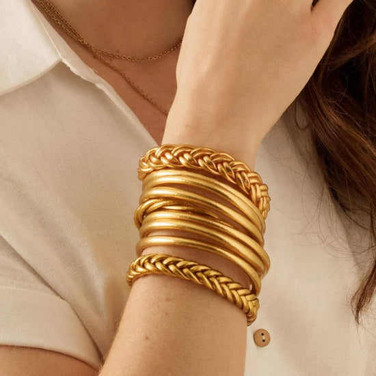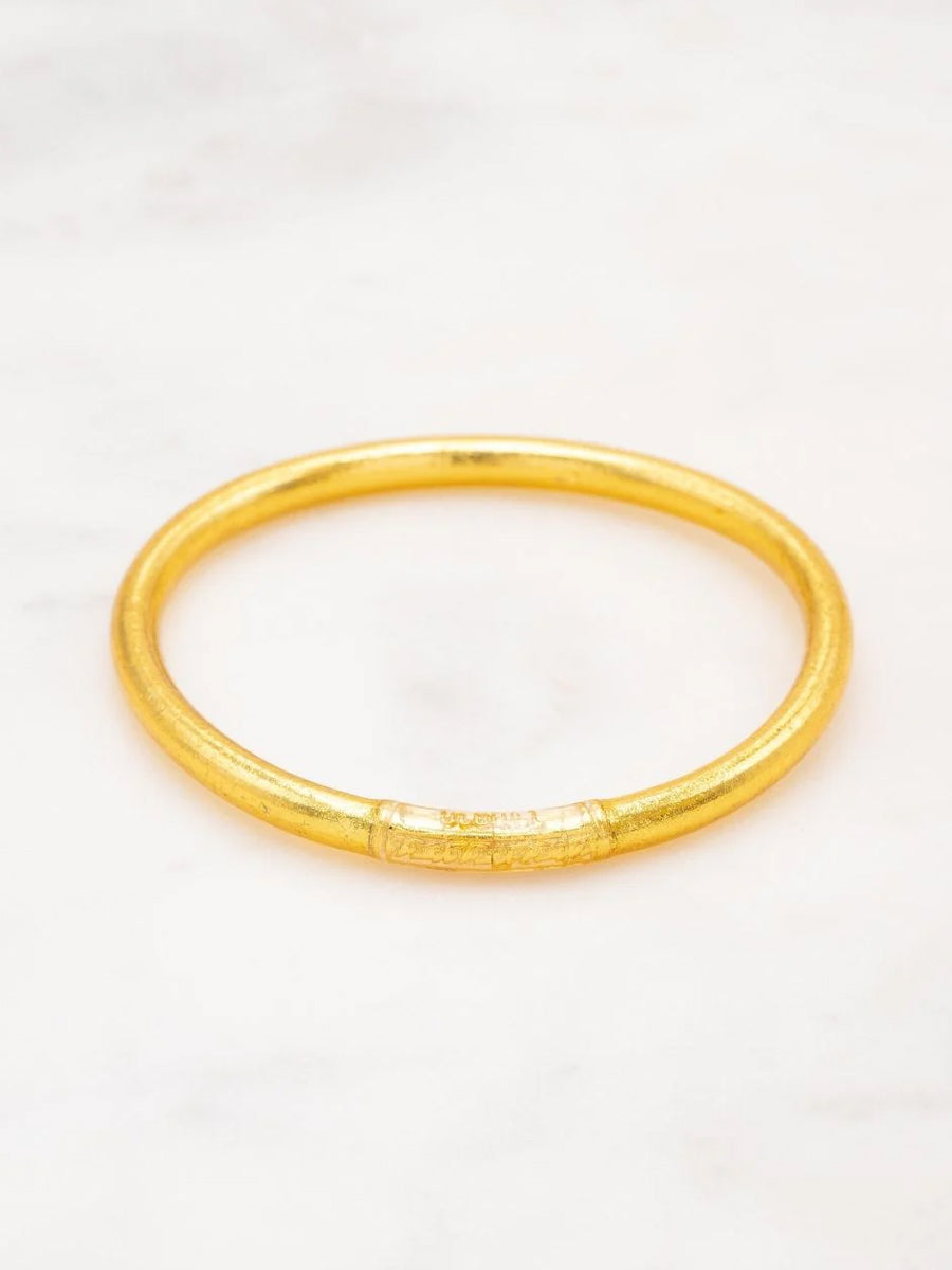 Craquez pour ce jonc souple transparent rempli de feuilles dorées décoratives, scellé avec un mantra gravé "Bonheur, Chance, Fortune et Amour" en thaïlandais. A cumuler sur le poignet.