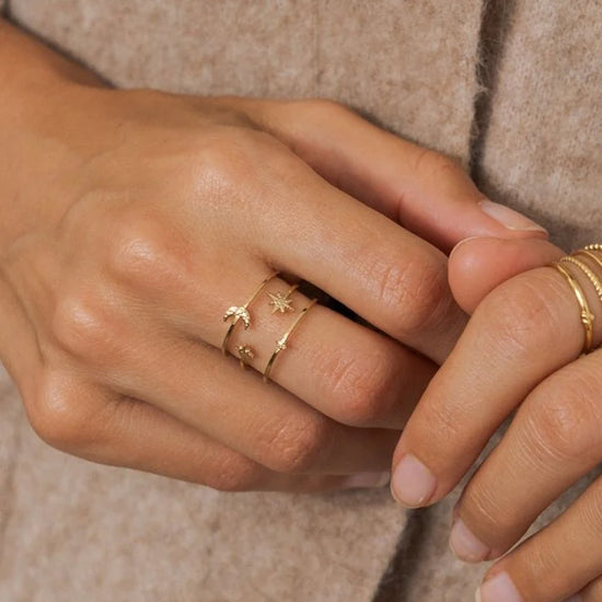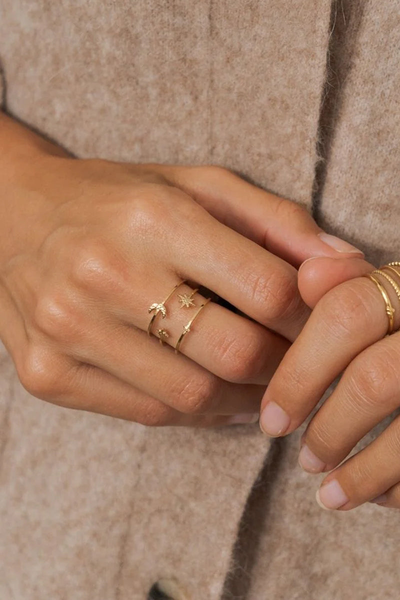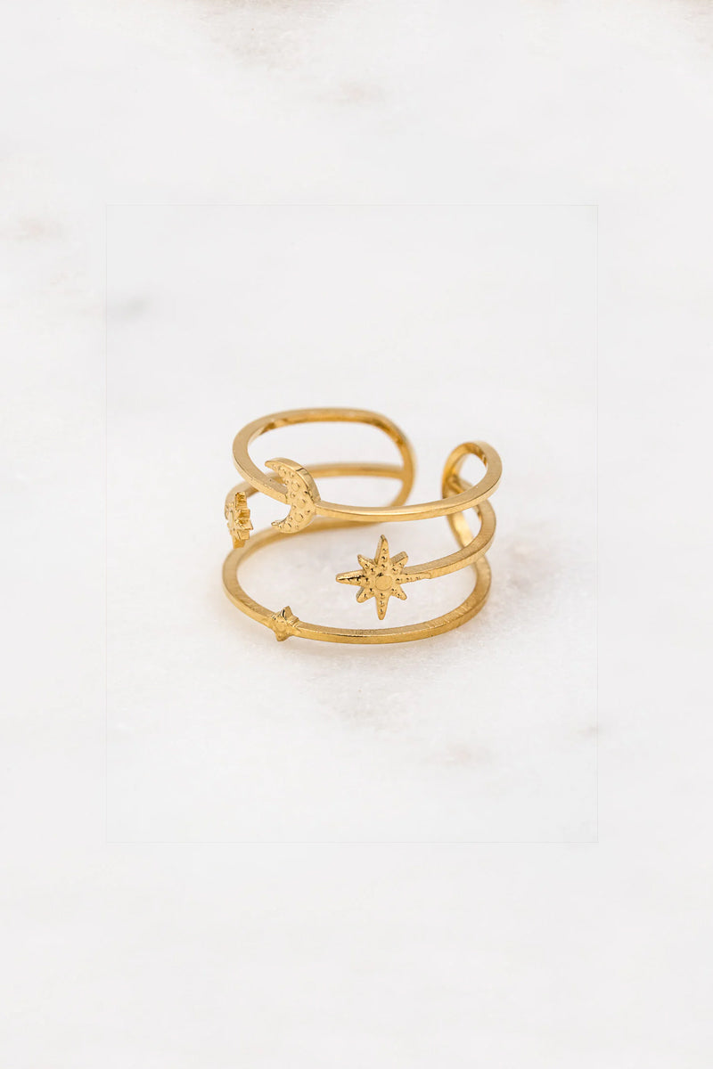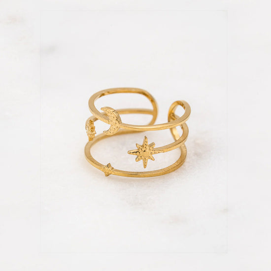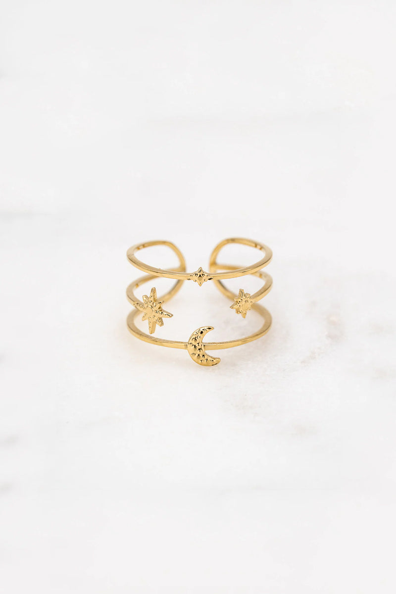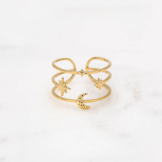 Bague ajustable composée de 3 rangs très fins avec de jolies petites étoiles et d'une lune.