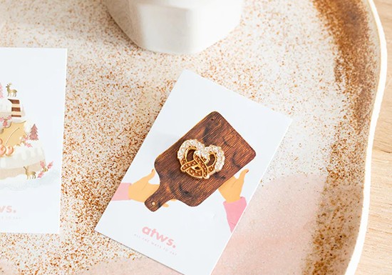 Parce qu’il n’y a pas que les bijoux qui se portent avec fierté, le Bretzel – Pin’s signé All the Ways to Say revisite la célèbre gourmandise en version dorée et émaillée.