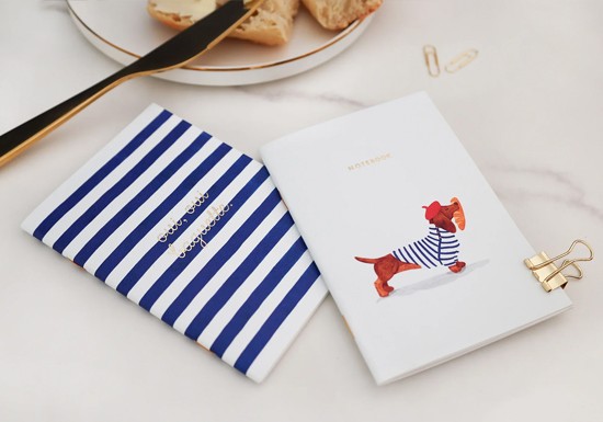 L’un montre un teckel habillé d’une marinière et d’un béret rouge portant une baguette, tandis que l’autre affiche de larges rayures bleues ornées d’une inscription dorée.