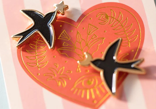 Lot de 2 pin's émaillés en forme d'hirondelles et présentées sur une jolie carte imprimée.
