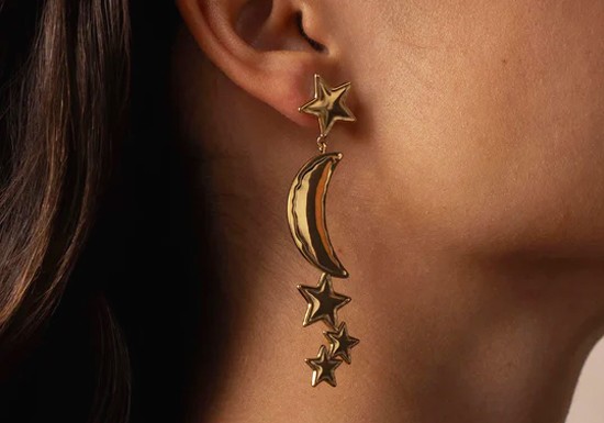 Grandes boucles d'oreilles pendantes en acier inoxydable composées d'une lune et d'étoiles, et disposées de manière asymétrique de chaque côté.