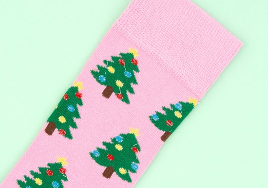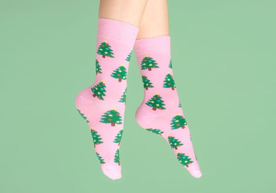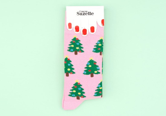 Le must-have de l’hiver : ces magnifiques chaussettes roses en coton à motif sapins magnifiquement décorés.